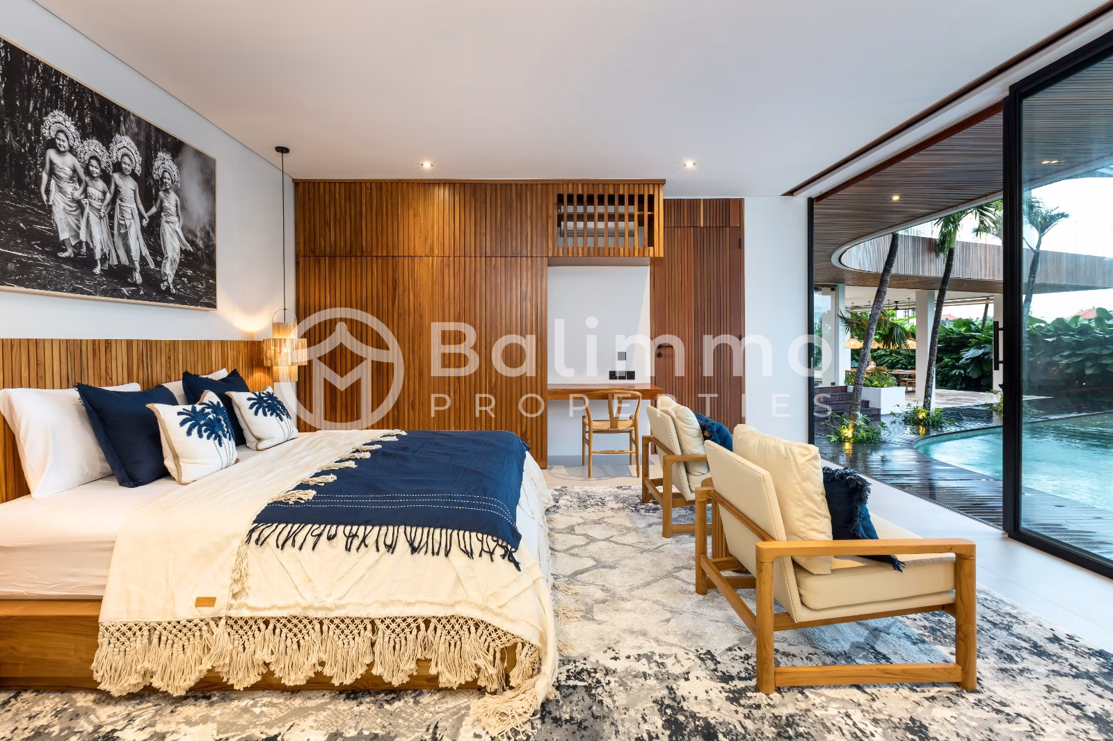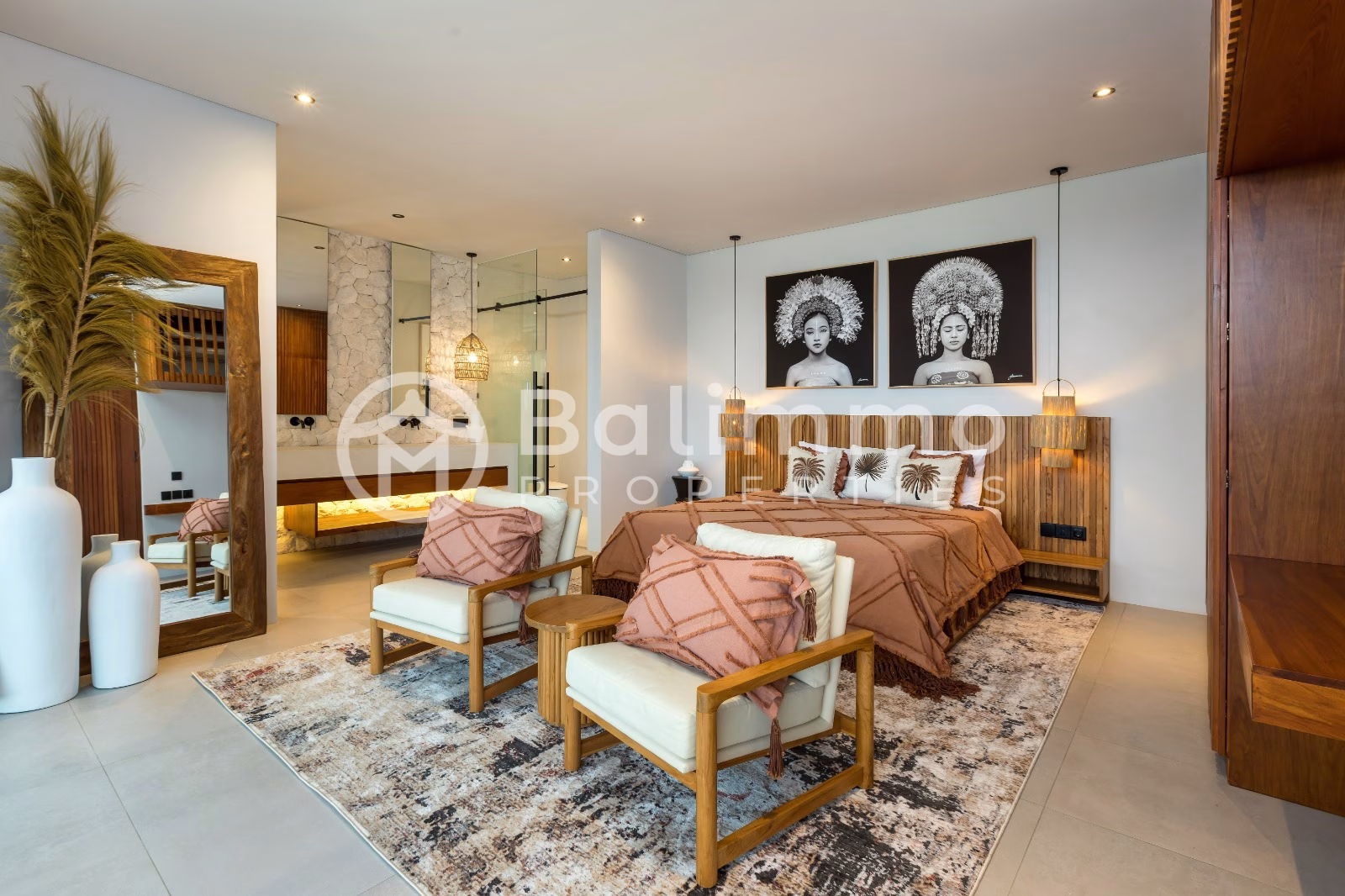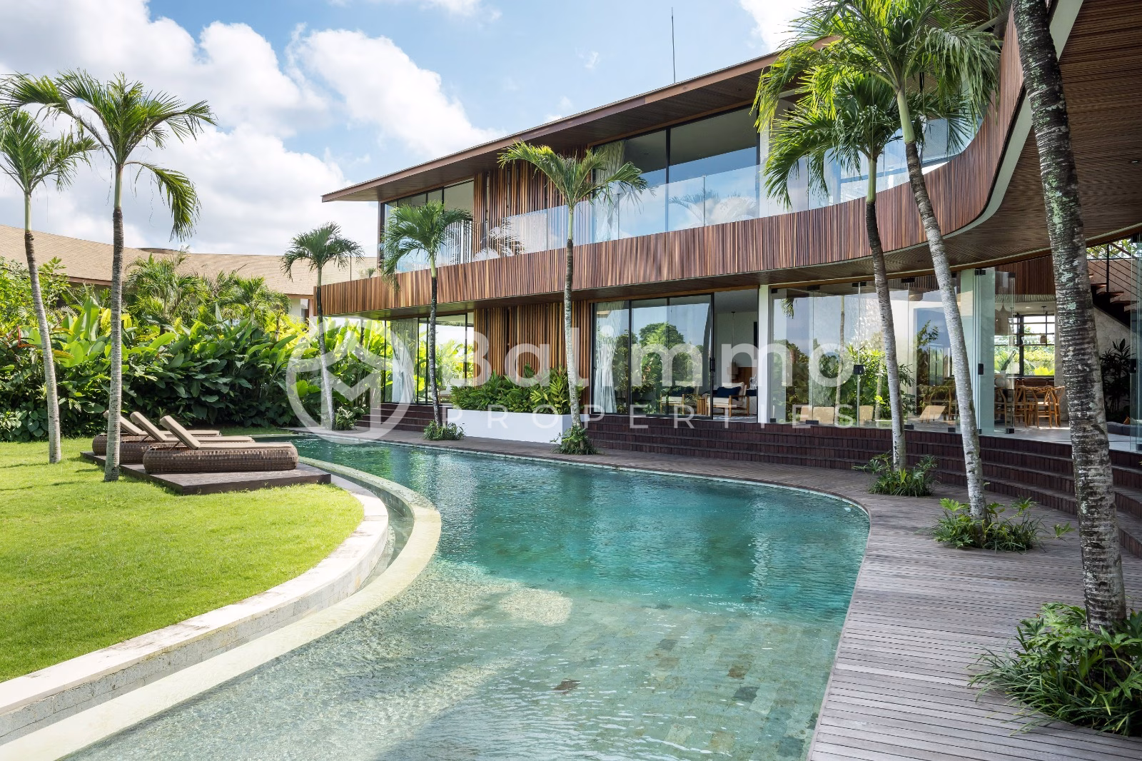 Contemporary Tropical Villa with High-End Design in Tumbak Bayuh Surroundings / Location Situated in the tranquil neighborhood of Tumbak Bayuh, this villa offers a quiet and upscale environment, just minutes from the vibrant hubs of Pererenan and Canggu. The area is known for its peaceful surroundings while remaining close to top cafes, restaurants, and international schools. Built on 1,130 sqm of land, the villa features exceptional build quality and was designed by Spanish architect Nacho of Biombo Architects. The architecture blends tropical elements with contemporary style. Highlights include a 94 sqm swimming pool, spacious garden, sunken seating area, and large terrace. A garage accommodates up to three vehicles. The 828 sqm building is spread over two floors and includes five bedrooms, plus an office and a cinema room. There are six bathrooms in total. The enclosed living area is equipped with air conditioning and connects to a fully equipped BOSCH kitchen and large dining area. Interior finishes include tropical hardwood ceilings and high-end furnishings throughout. Staff quarters are also included. Additional Information * Leasehold until 2 December 2066 * Land size: 1,130 sqm * Building size: 828 sqm * 5 bedrooms + office + cinema room * 6 bathrooms * Fully furnished * Parking for 3 vehicles * Permit: SHGB * Zoning: yellow (residential) * Selling price: IDR 32 billion (approx. USD 1,900,000) BALIMMO PROPERTIES – Contact us to schedule a visit.