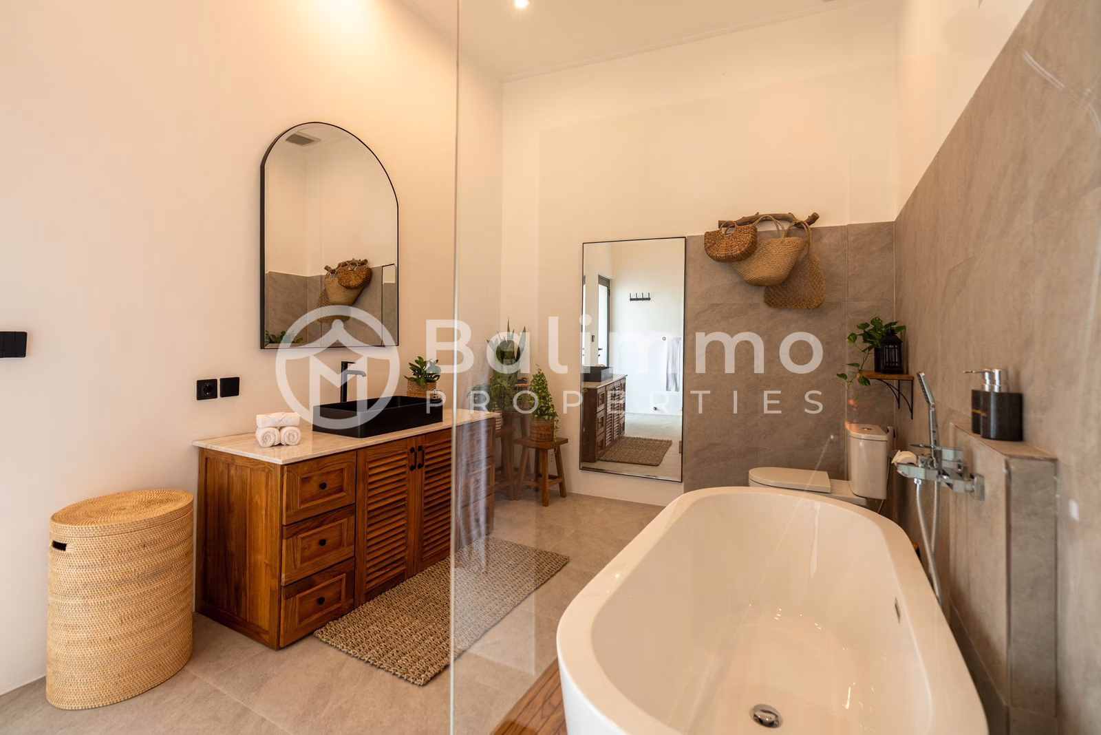 Brand-New Leasehold Villa for Sale – Tumbak Bayuh, Canggu Located in the sought-after area of Tumbak Bayuh, this newly completed modern villa offers both comfort and convenience. The property is just 10 minutes from Pererenan Beach, 20 minutes from Batu Bolong Beach, and 25 minutes from Berawa Beach, with Ngurah Rai International Airport approximately 50 minutes away. The neighborhood is peaceful yet close to popular cafés, restaurants, and international schools in the Canggu area. Built on 130 m² of land, the villa features a sleek modern design with clean lines and functional outdoor spaces. It includes a 3 x 8 m swimming pool, a small tropical garden, and a private parking area suitable for one car and one motorbike. The property also comes with a water filtration system for daily use. Spanning two floors and 180 m² of building size, the villa offers three ensuite bedrooms and three bathrooms. The layout includes a closed living room, a fully equipped kitchen, and a relaxing lounge area with Netflix TV. The villa is fully furnished with modern fittings and offers ample storage space, designed for both comfort and practicality. Additional Information • Leasehold: 37 years • Land size: 130 m² • Building size: 180 m² • Pool: 3 x 8 m • 3 ensuite bedrooms • Closed living room • Fully furnished • Parking for 1 car and 1 motorbike • Storage room and water filter system • Two floors • Modern design Zoning Yellow For Sale Leasehold 37 Year +extance 25 Year Asking Price: IDR 5.500.000.000 BALIMMO PROPERTIES – Contact us to schedule a visit.