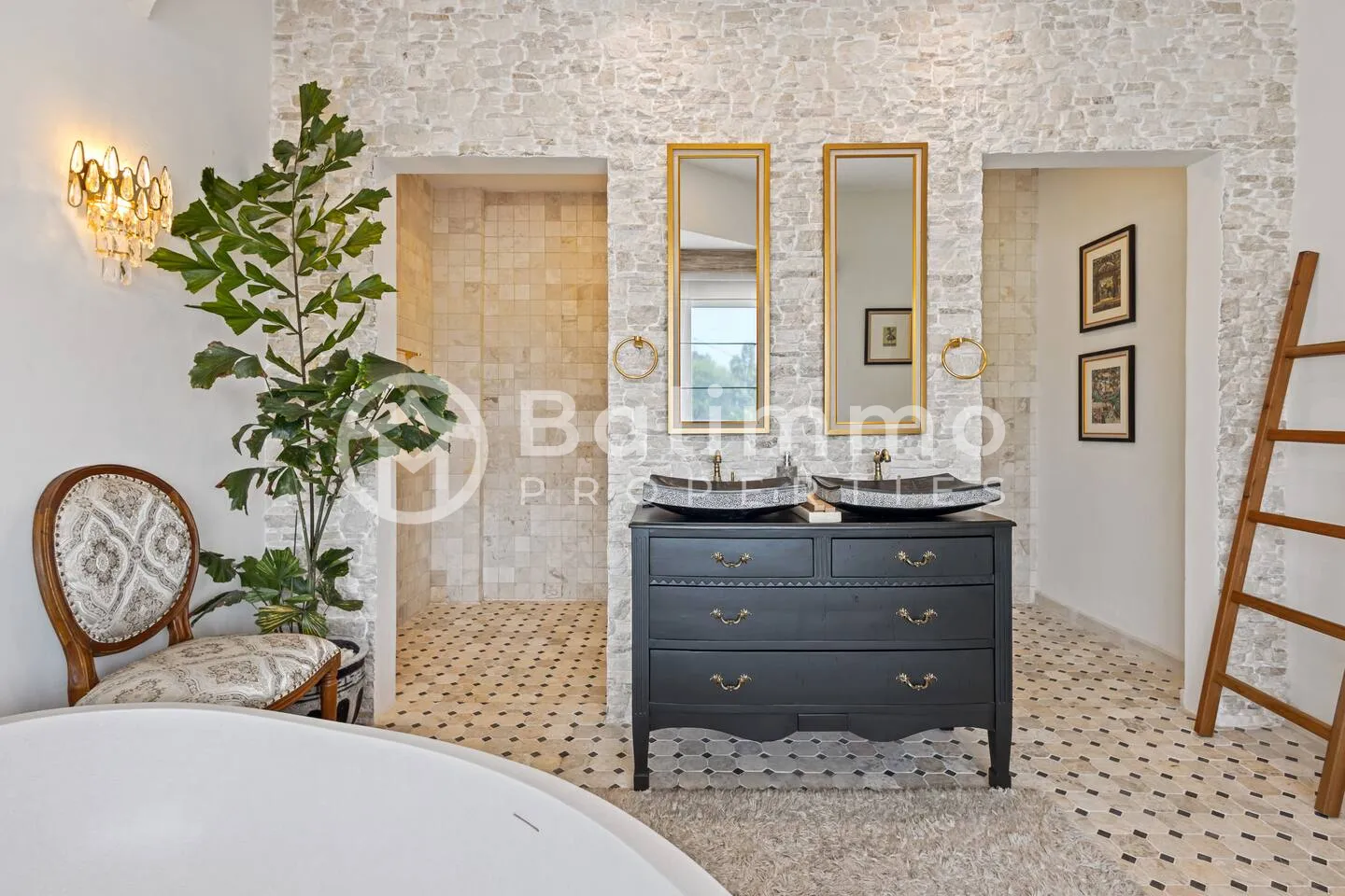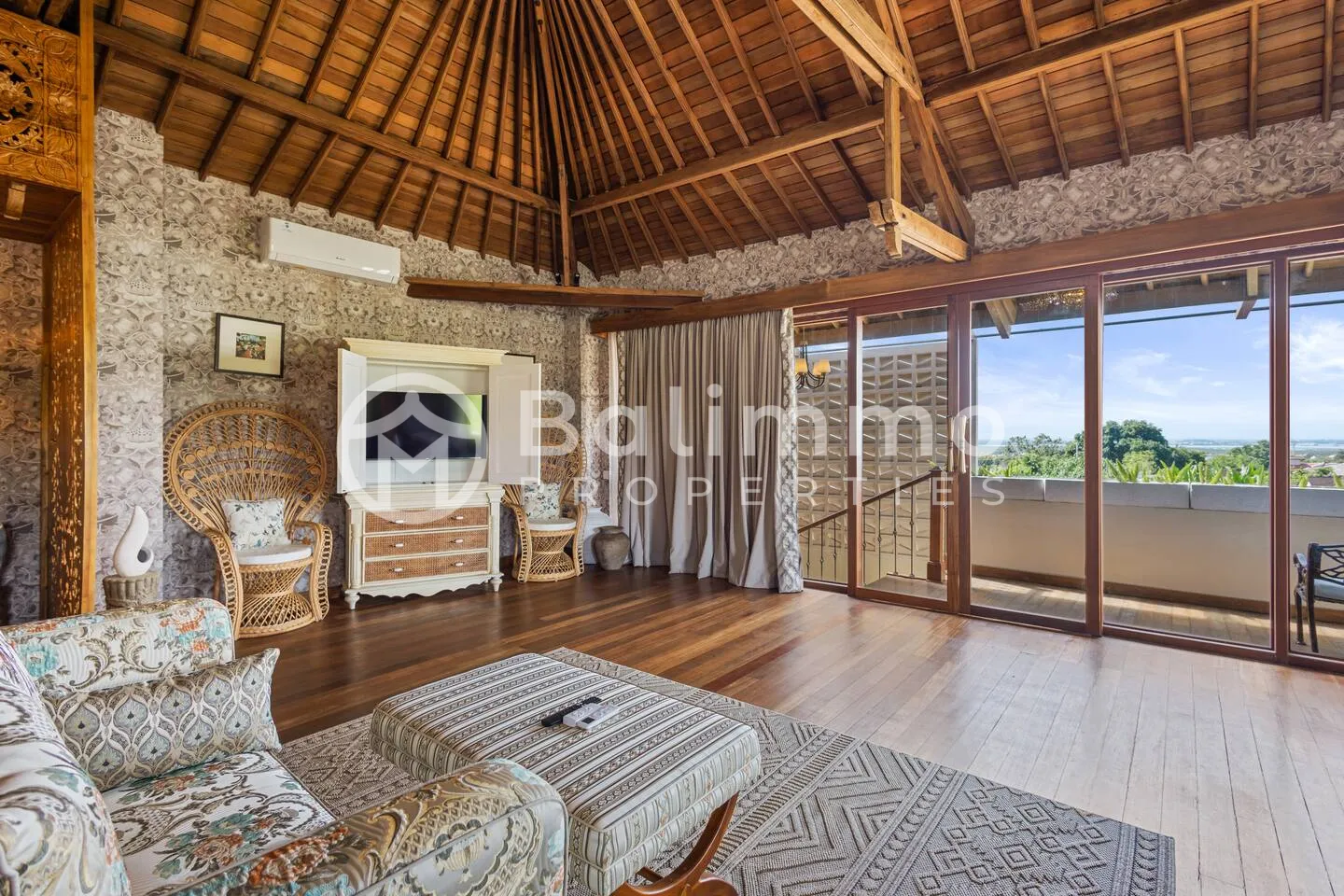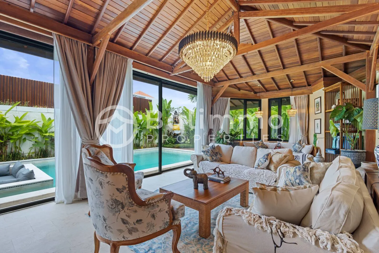 Jimbaran Classic Villa Located in Jimbaran, this villa is 5–10 minutes from Jimbaran Beach and its beachfront seafood restaurants, 15 minutes from Rock Bar at AYANA and GWK Cultural Park, and 20–25 minutes from Balangan, Dreamland, and Uluwatu beaches. Built on 420 m2 of land, the property features a private swimming pool, barbecue area, and private parking. The design combines classic European style with Balinese elements. The 330 m2 interior includes four bedrooms (including a kids’ room), a spacious living room, walk-in wardrobe, home office, and storage. Interiors include hand-carved panels, chandeliers, patterned wallpapers, and custom textiles. Leasehold 25 years + 15-year extension guaranteed. Newly built with SLF and PBG permits. Yellow zoning. BALIMMO PROPERTIES – Contact us to schedule a visit.