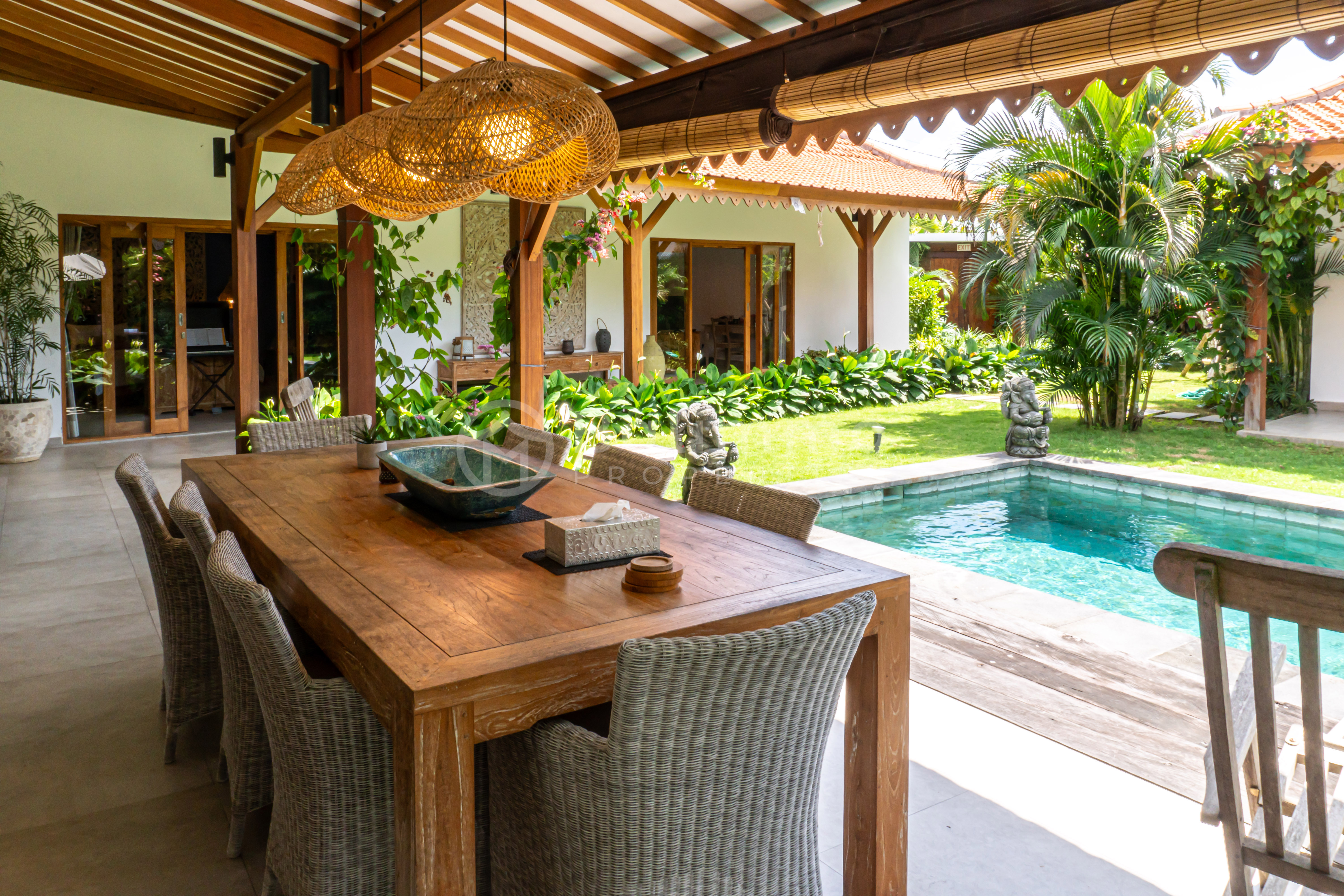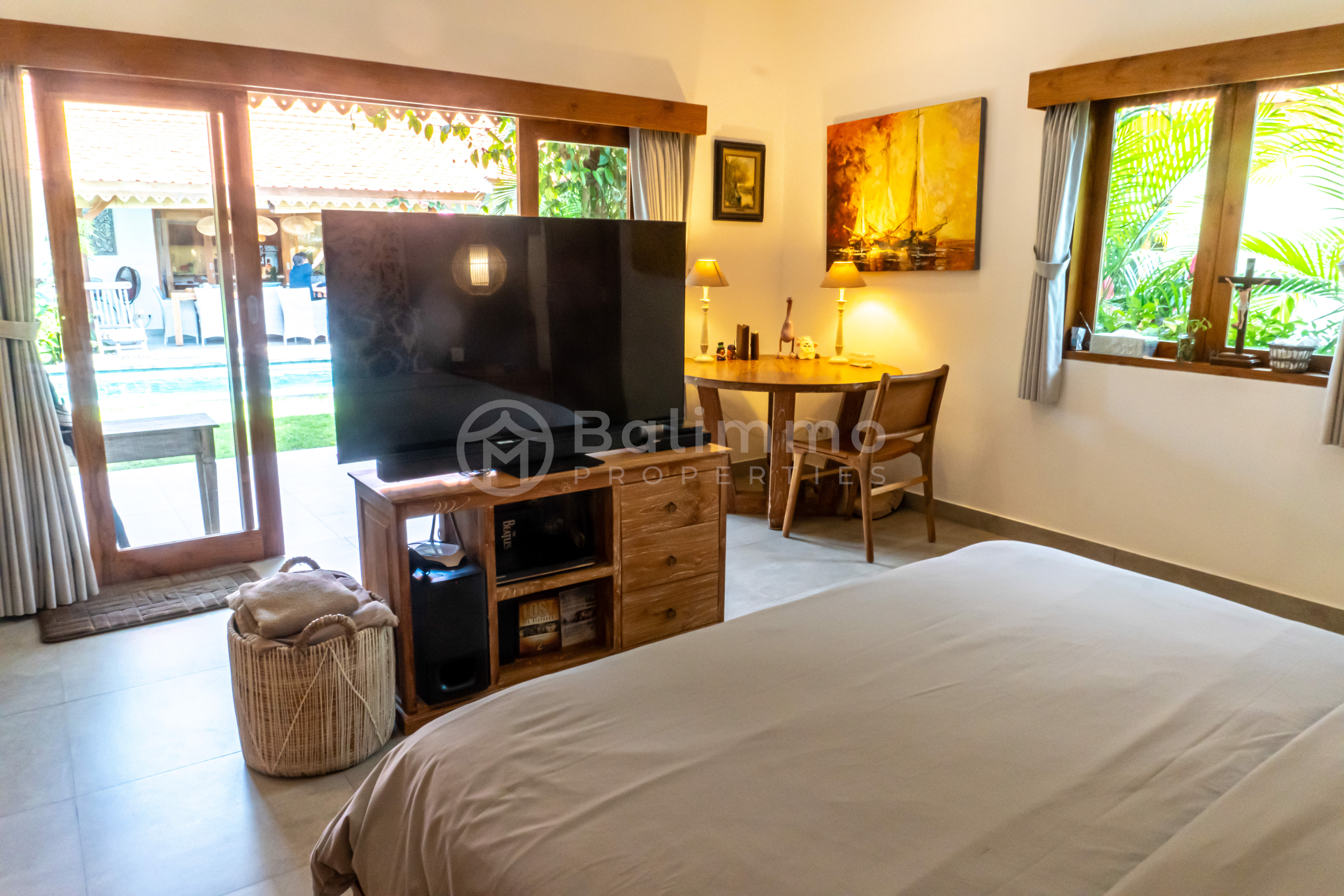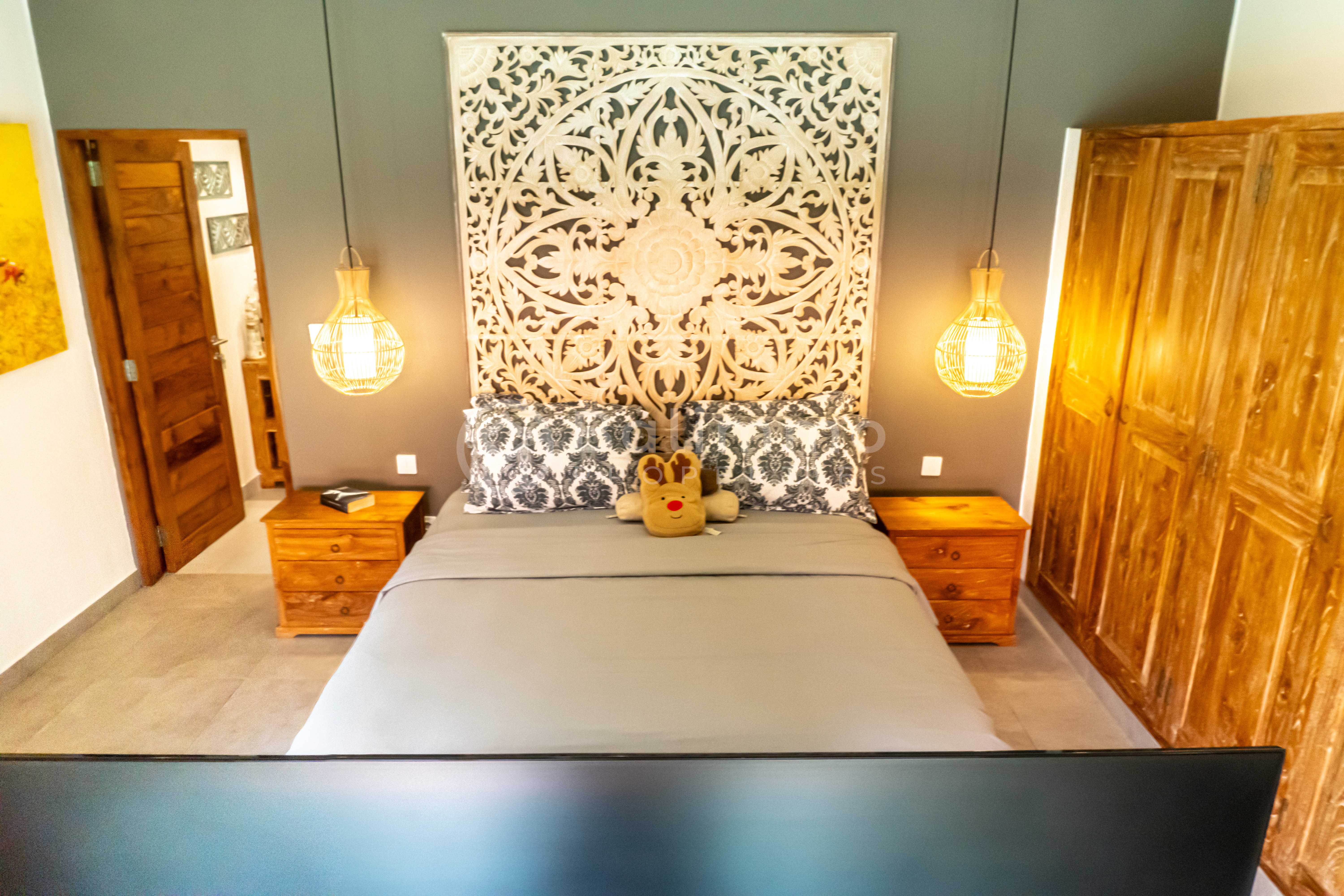 Nestled in Buduk, Mengwi, this Villa Bamboo Whisper offers a peaceful residential setting while remaining within easy reach of Pererenan, Canggu, and Batu Bolong’s cafés, restaurants, and beaches. The property is situated in a yellow-zoned area, ideal for residential living, and enjoys good road access to Denpasar and the airport. Set on a generous 730 m² plot, the villa features a spacious garden and a private swimming pool surrounded by sun loungers and tropical landscaping. The property offers ample parking space and a secure gated entrance. Completed in 2023, the architecture blends modern lines with tropical touches, creating a harmonious indoor-outdoor lifestyle. The building spans 330 m² over a single level, offering four bedrooms, each with its own en-suite bathroom. The open-plan living and dining area flows seamlessly into a fully equipped modern kitchen. Large glass sliding doors fill the space with natural light and connect to the poolside terrace. High-quality finishes and furnishings ensure comfort and style, making the property move-in ready. Key details : • Leasehold until 1 December 2048 • Fully furnished • Year built: 2023 • Land zone: Yellow zone (residential) • Permit : Hak Milik • Price : IDR 8.116.250.000 • USD : 507.266 BALIMMO PROPERTIES – Contact us to schedule a visit.